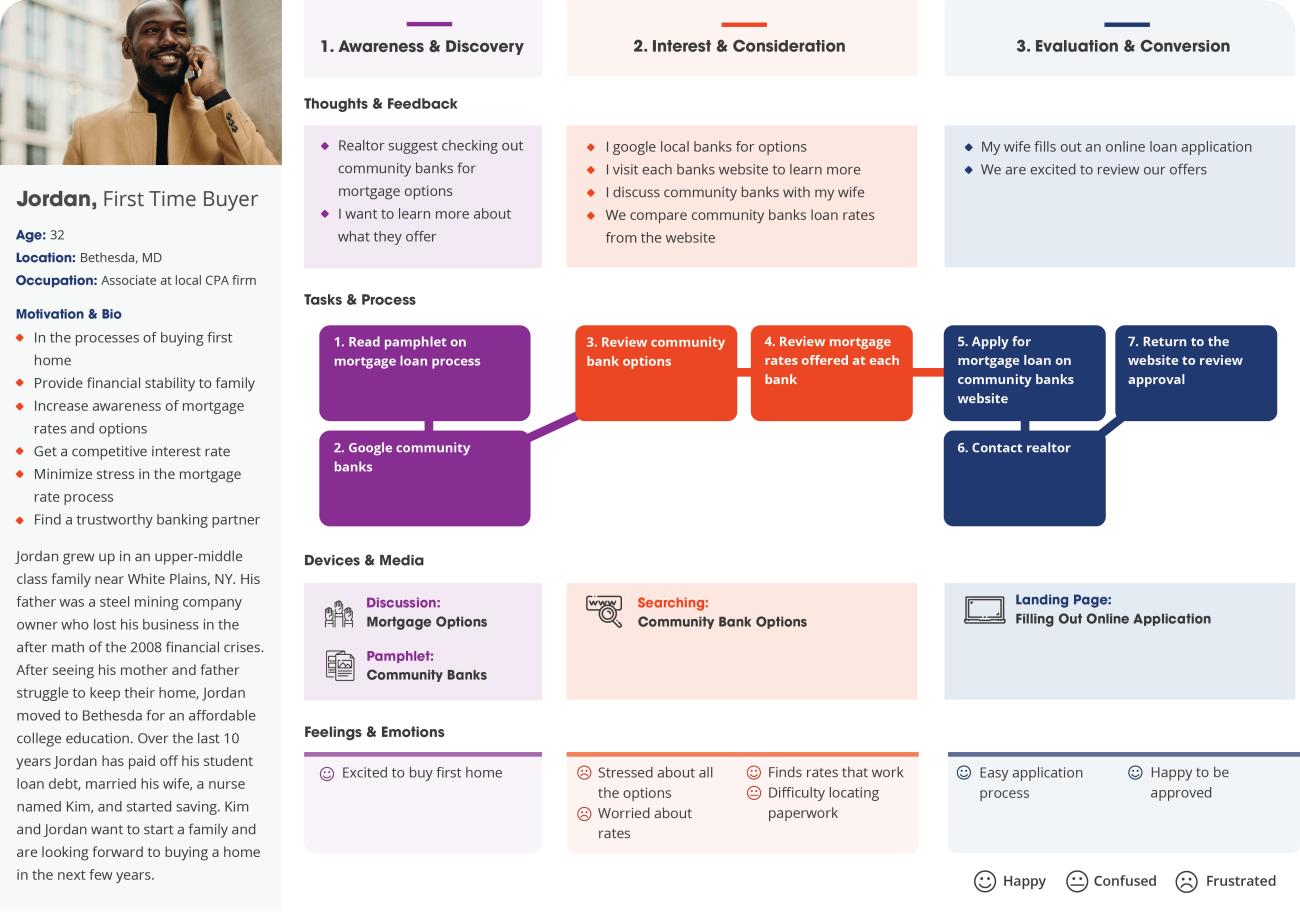 In web development and design, we do this by developing user journeys and user personas. A user persona is a representation of your target audiences created with demographic, psychographic, and behavioral data. Persona's for a mortgage marketing program could include: